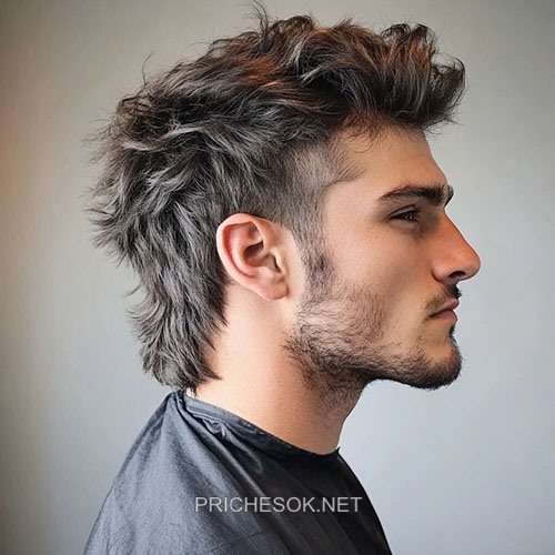 Стрижка маллет с торчащими прядями может потребовать больше мастерства (и средств для укладки), чем другие варианты, но результат получается оригинальным и смелым. Волосы средней длины ниспадают от лба до затылка, а торчащие пряди направлены во все стороны. Более короткие волосы по бокам создают резкий контраст, визуально приподнимая голову, а щетина на лице добавляет образу зрелости, которая хорошо сочетается с прической.