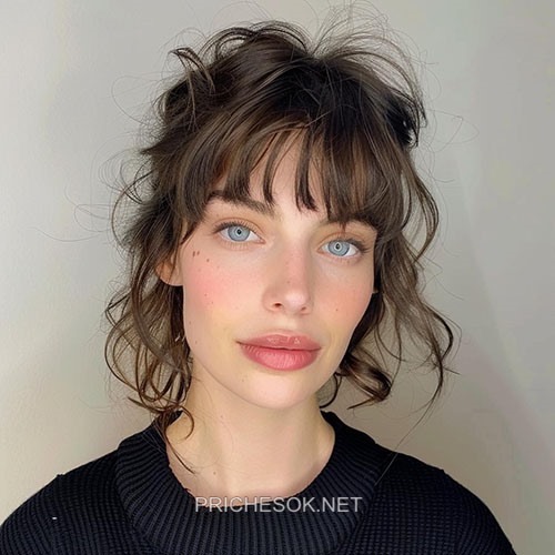 Повседневный небрежный пучок в сочетании с растрепанной челкой создает расслабленный богемный образ. Идеально подходит для спонтанных прогулок или спокойного дня в городе.