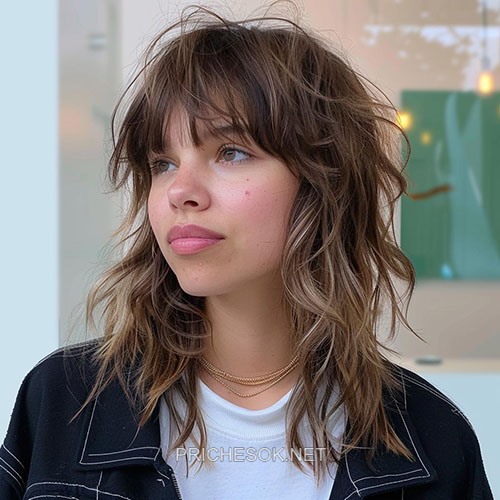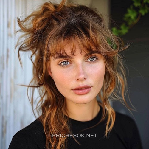Мягкий крой этой волчьей стрижки сочетает игривые слои с романтичными волнами и легкой небрежной челкой спереди. Идеально подходит для тех, кто предпочитает беззаботный, но стильный образ.