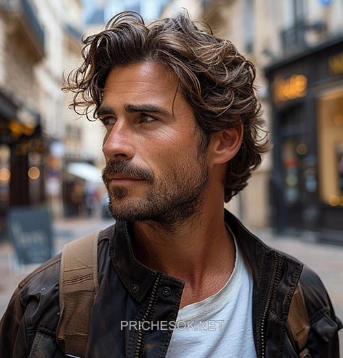 Эта мужская стрижка средней длины особенно хорошо смотрится с волнистыми или слегка растрепанными волосами. В сочетании с короткой бородой (лучше длиннее, чем щетина, но аккуратно подстриженной) — она выглядит доступно, романтично и непринужденно. Отлично подходит для торжественного случая.